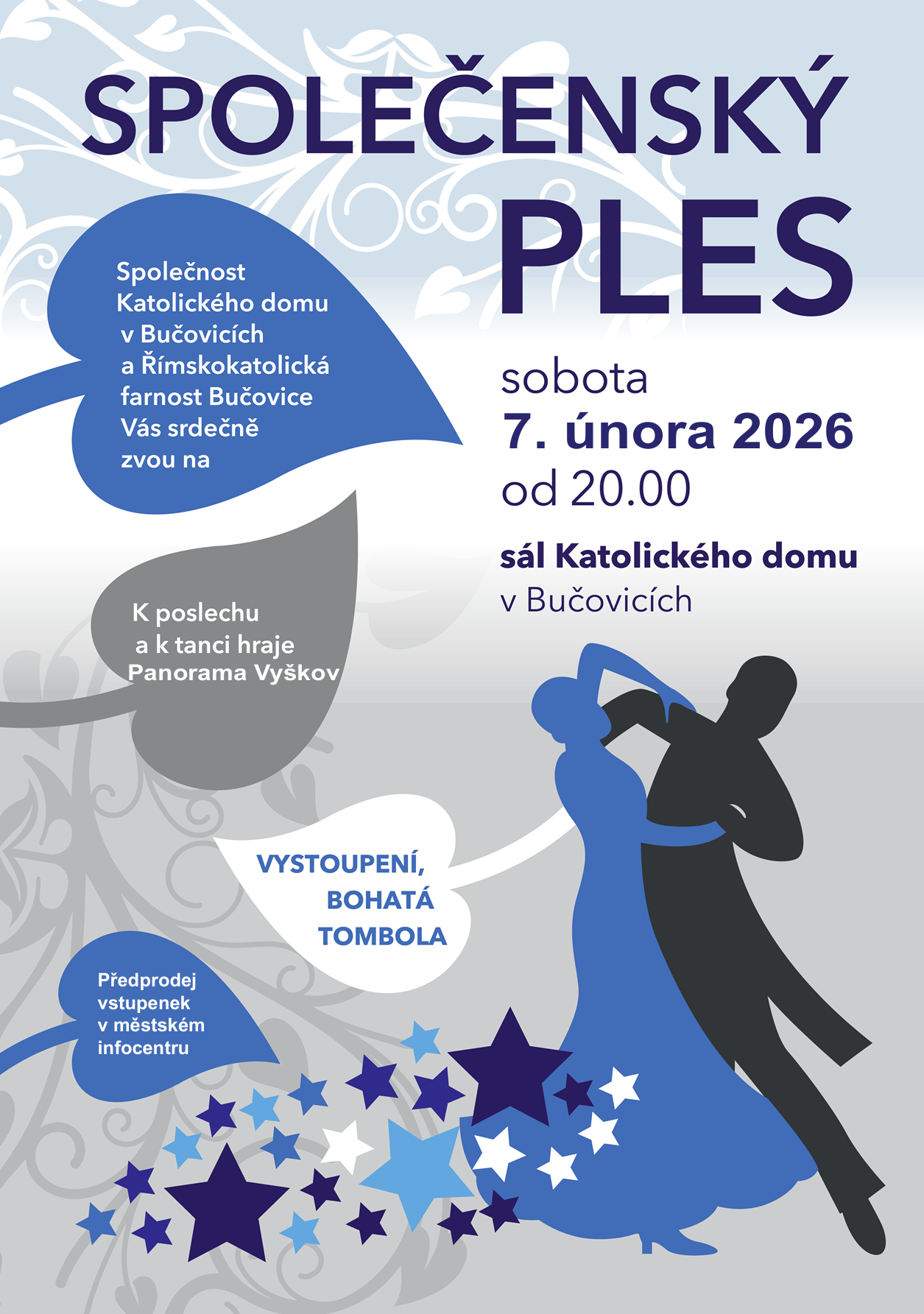 Společnost Katolického domu v Bučovicích a Římskokatolická farnost Bučovice srdečně zvou na společenský ples, který se koná v sálu Katolického domu v Bučovicích v sobotu 7. února 2026 od 20:00 hod.. K poslechu a tanci hraje kapela Panorama.